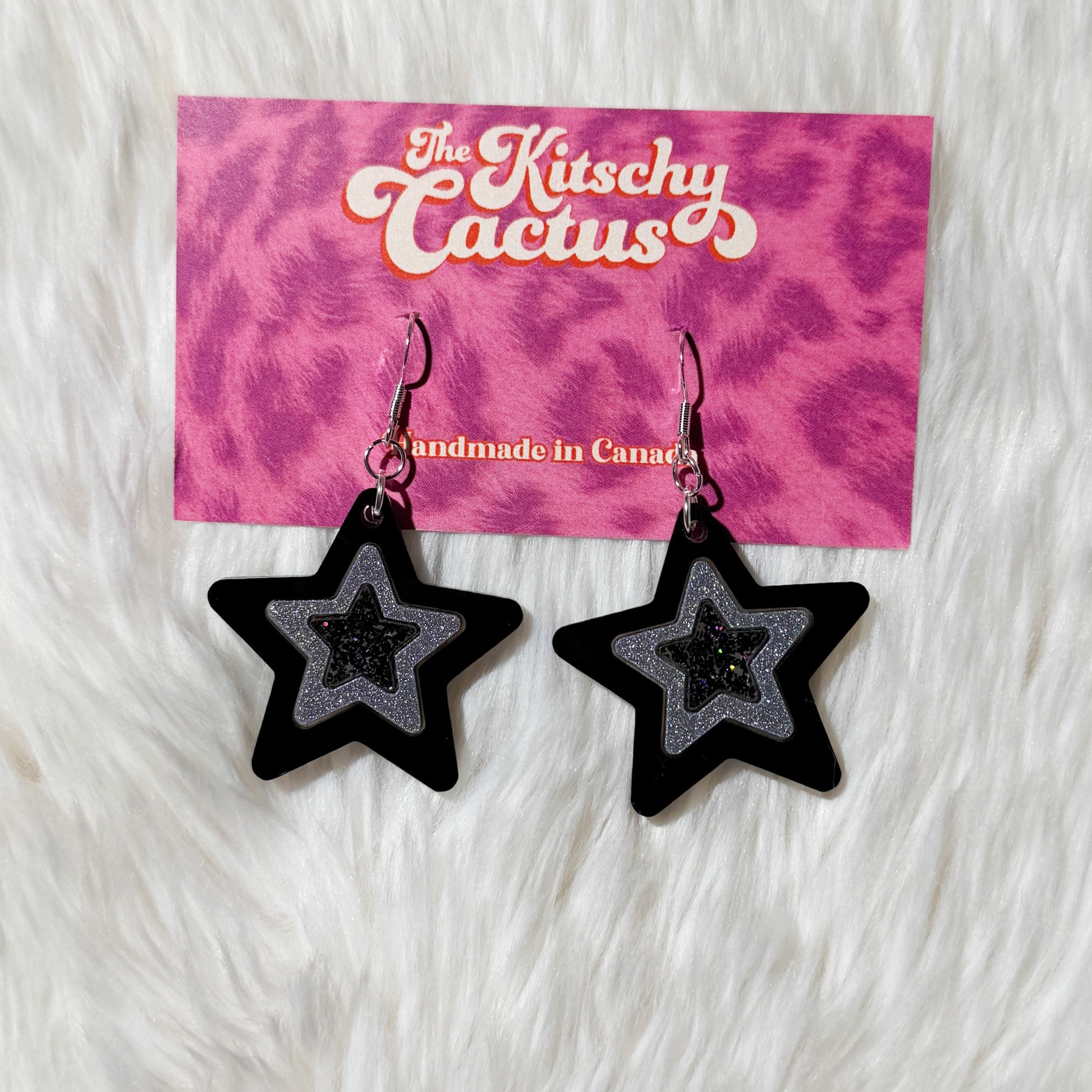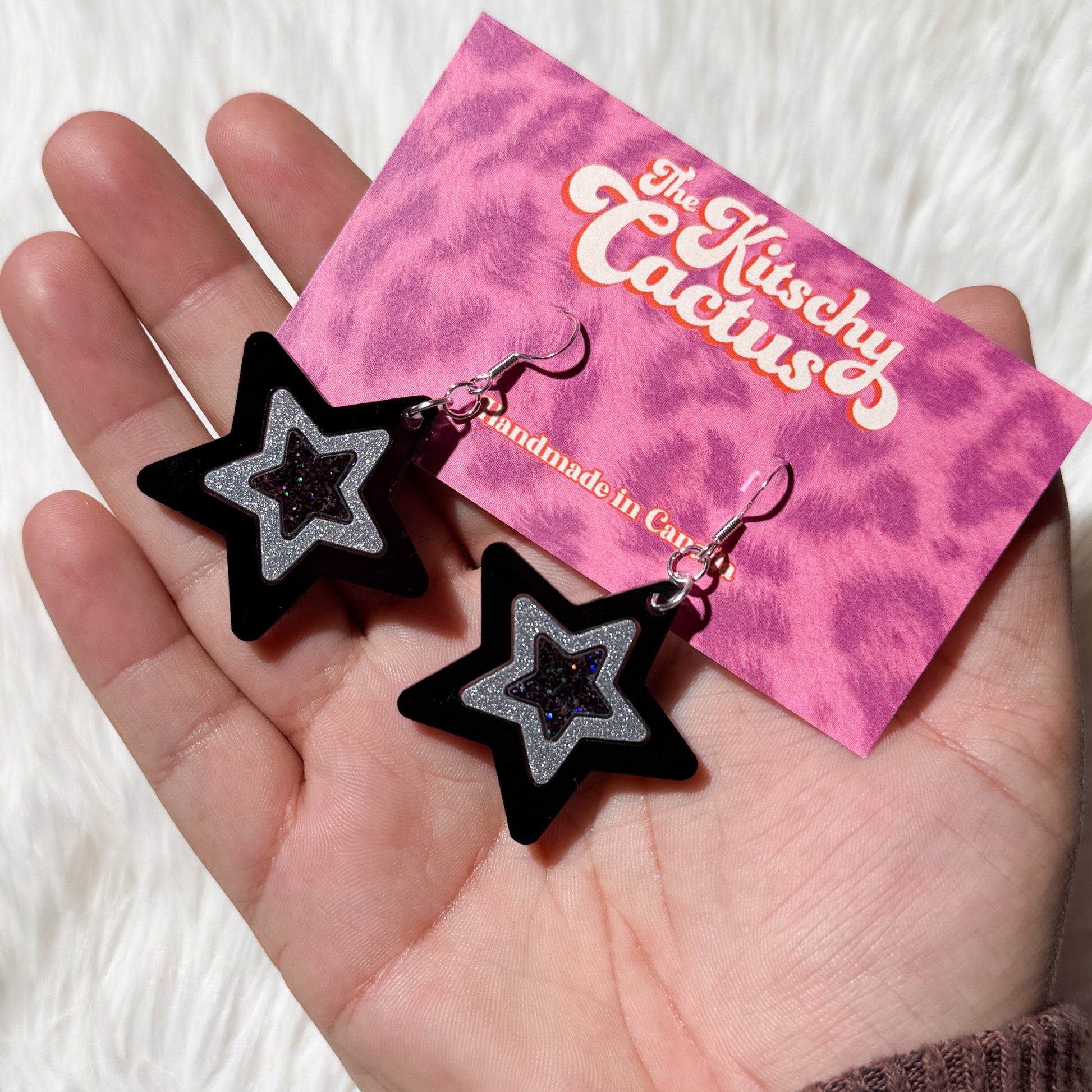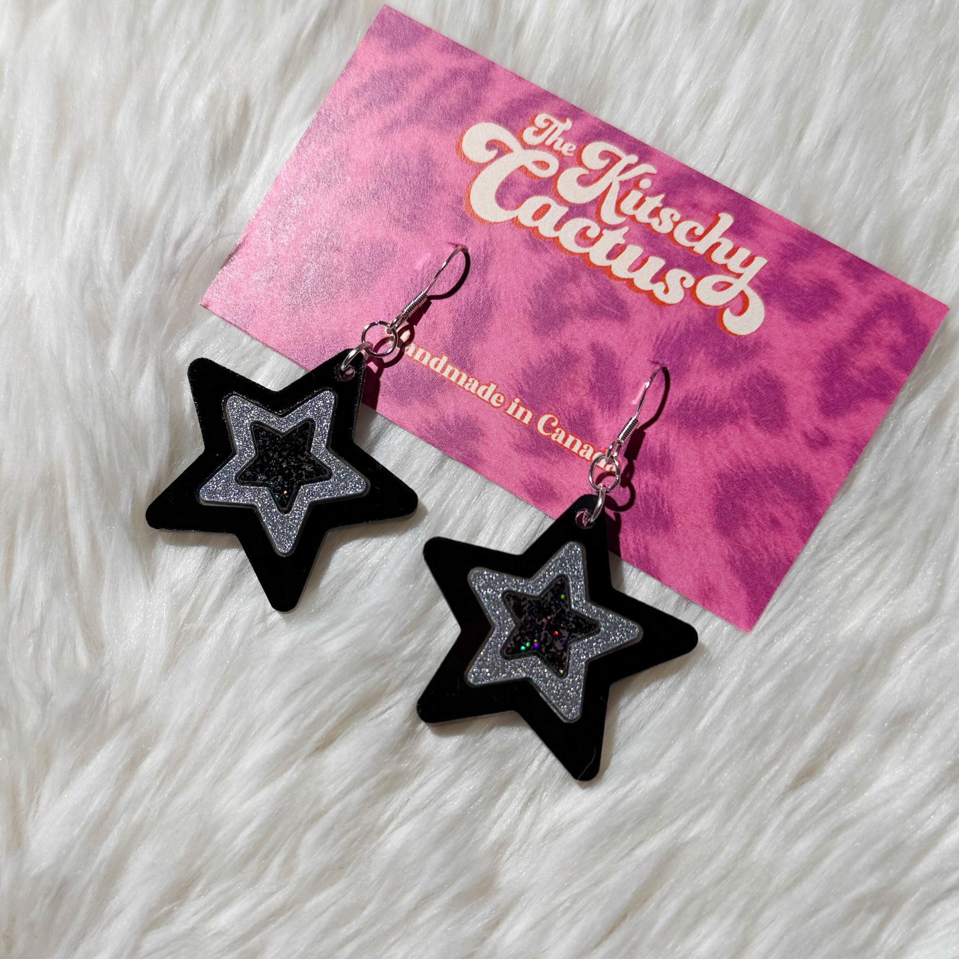 ⭐ Rock star energy! These bold black and silver stars bring serious glam-rock vibes. Perfect for channeling your inner Rockstar or adding edge to any outfit.
